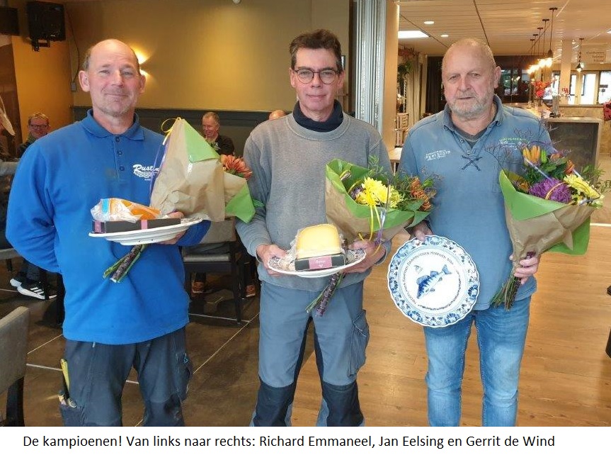 Terug in het dorpshuis en na het broodje bal volgde de prijsuitreiking waarbij Andre van Kleef met 90 stuks het Delfts Blauwe bord als winnaar in ontvangst mocht nemen. Peter Posthumus werd met slechts 1 baarsje verschil en een totaal van 89 stuks tweede en de derde plaats was met 82 stuks voor Pieter Oostwouder. De organisatie kijkt terug op een zeer geslaagde ochtend waarbij het gemiddeld aantal baars per visser op 48,9 lag.