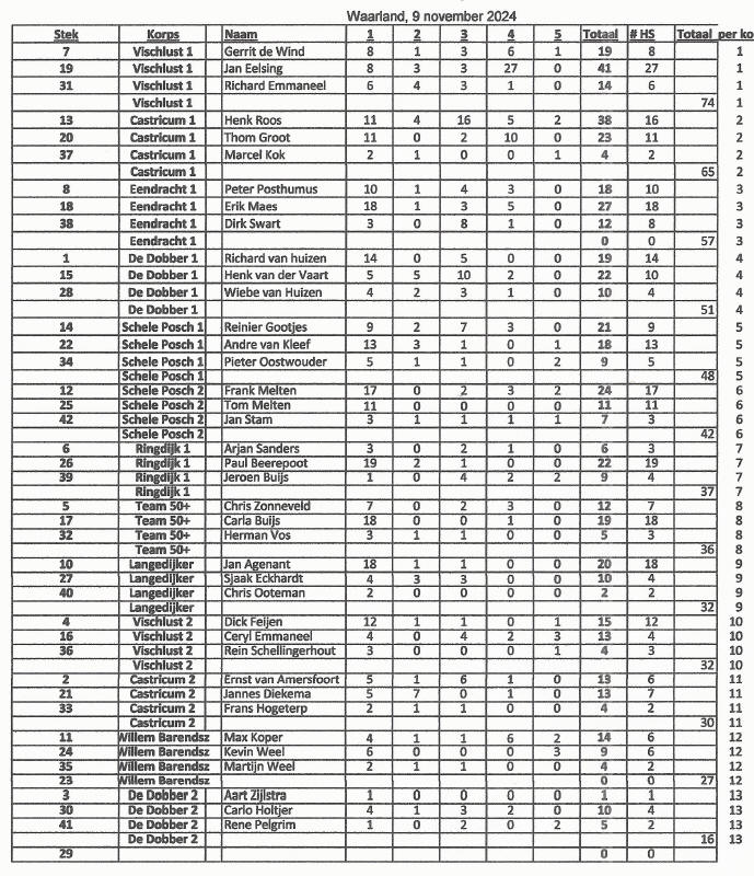 Op zaterdag 9 november 2024 is het Nederlands Kampioenschap Korpsen Baarsvissen gehouden. Een korps bestaat uit 3 personen die zo geloot zijn dat zij op het parcours zo verdeeld zijn dat 1 aan het begin en 1 in het midden en 1 aan het eind van het parcours staat. Wat de korpsleden individueel vangt wordt bij elkaar opgeteld en dat is de vangst van het korps. Hsv Vischlust deed mee met twee korpsen waarvan korps 1 in totaal de meeste baarzen vingen van alle 13 deelnemende korpsen en zodoende Nederlands kampioen werden. Het korps bestond uit Gerrit de wind, Jan Eelsing en Richard Emmaneel. Voor de volledigheid het 2e korps werd 10e van de 13 deelnemende korpsen.