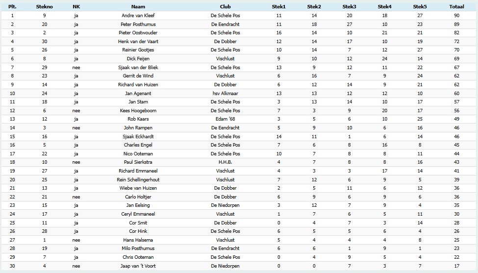 Pieter Oostwouder ging goed van start en liet hier met 16 stuks het hoogste aantal noteren. Hij werd gevolgd door Sjaak Eckhardt die er 14 ving en Sjaak van der Bliek en Jan Agenant die allebei op 13 stuks uitkwamen. De 2e stek was iedereen een beetje gewend aan het diepere water waardoor meer vissers in de dubbele cijfers eindigden. Peter Posthumus wist hier met 18 stuks de meeste baars bij elkaar te vangen gevolgd door “Good Old” Gerrit de Wind met 16 stuks en 4 man met 14 stuks. De 3e stek stonden de lage nummers nog op de betonnen schoeiing en de rest stond in het riet. Of het veel uitmaakte vertelt het verhaal niet, maar Peter Posthumus haalde hier behoorlijk uit door 27 baars te vangen. Ook Andre van Kleef kwam met 20 stuks sterk opzetten. De 4e stek wist lokale favoriet Dick Feijen met 24 stuks de meeste baars te vangen gevolgd door Pieter Oostwouder met 21 stuks en Kees Hoogeboom met 20 stuks, beide van visclub de Schele Posch. De 5e stek waar het riet op het water lag moest de beslissing brengen. Er waren een drietal vissers die dicht bij elkaar stonden in de tussenstand. Op deze stek werd duidelijk de meeste baars gevangen. Andre van Kleef was hier in zijn element en wist hier 27 baars te vangen. Dit lukte trouwens “de man in vorm” Reinier Gootjes ook en ook de gastvisser uit de Regio West Rob Kaars deed hier met 25 stuks goede zaken.