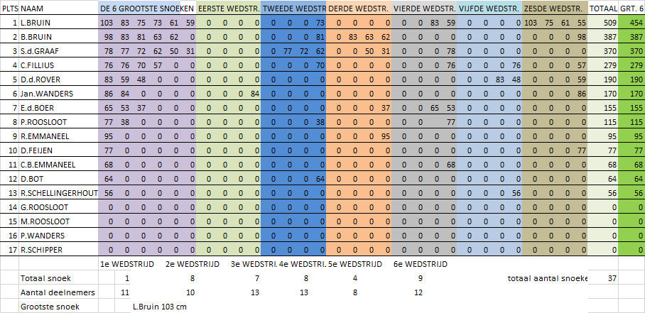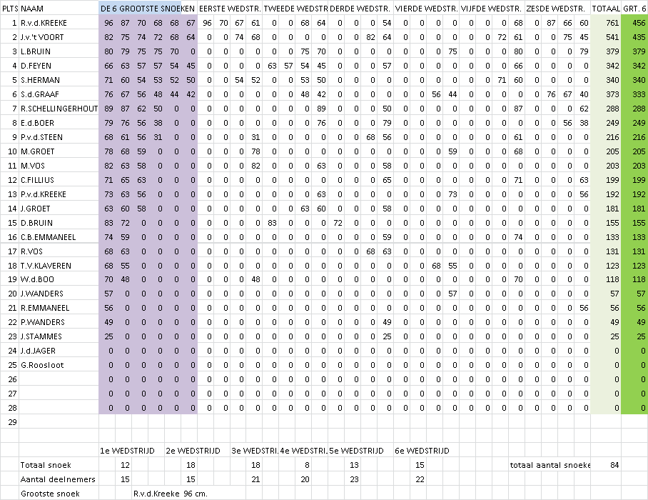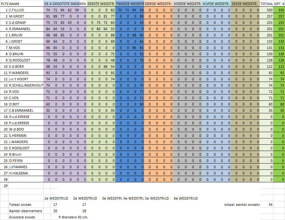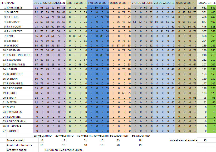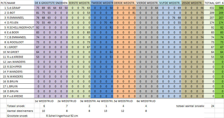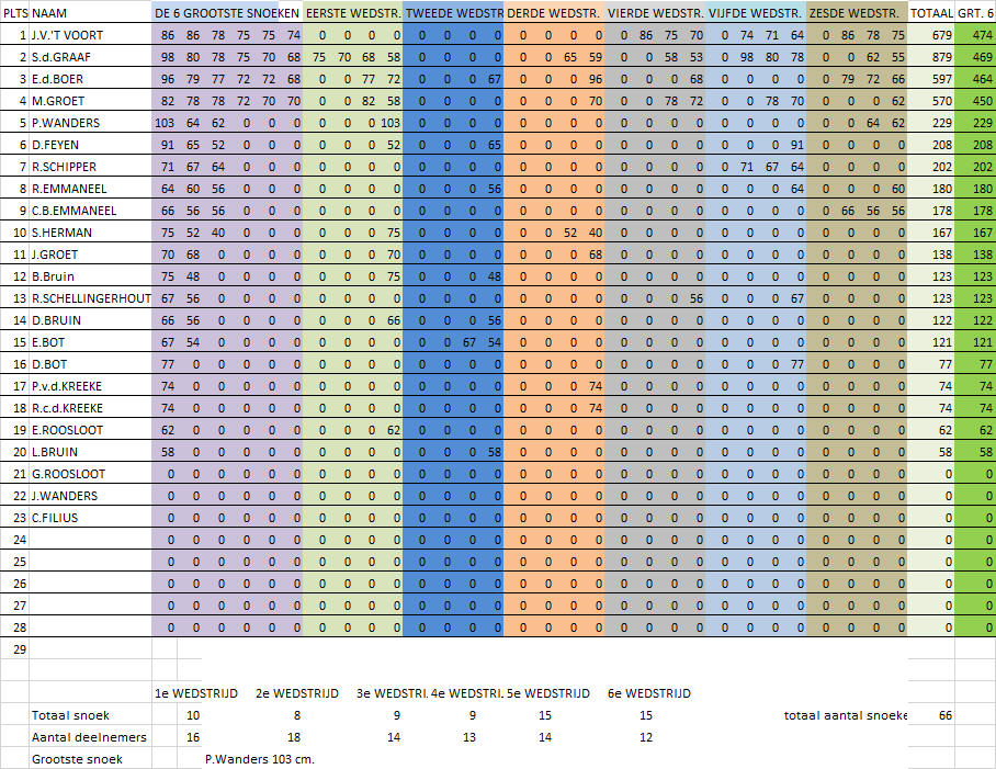 Voor de einduitslag zijn maximaal zes (de grootste) snoeken die de deelnemer gedurende de competitie heeft gevangen bepalend. De winnaar van de competitie is derhalve degene die met zijn/haar maximaal zes grootste snoeken de meeste centimeters heeft gevangen. Tweede wordt degene die hierna met zijn/haar grootste zes snoeken de meeste centimeters heeft gevangen etc. Er waren deze competitie overigens slechts 2 vissers die een rijtje van 6 snoeken wisten vol te vissen. De vangst was deze competitie weer niet al te geweldig. In totaal werden er over 6 wedstrijden slechts 37 snoeken gevangen. De uitslag van de snoekcompetitie is:
