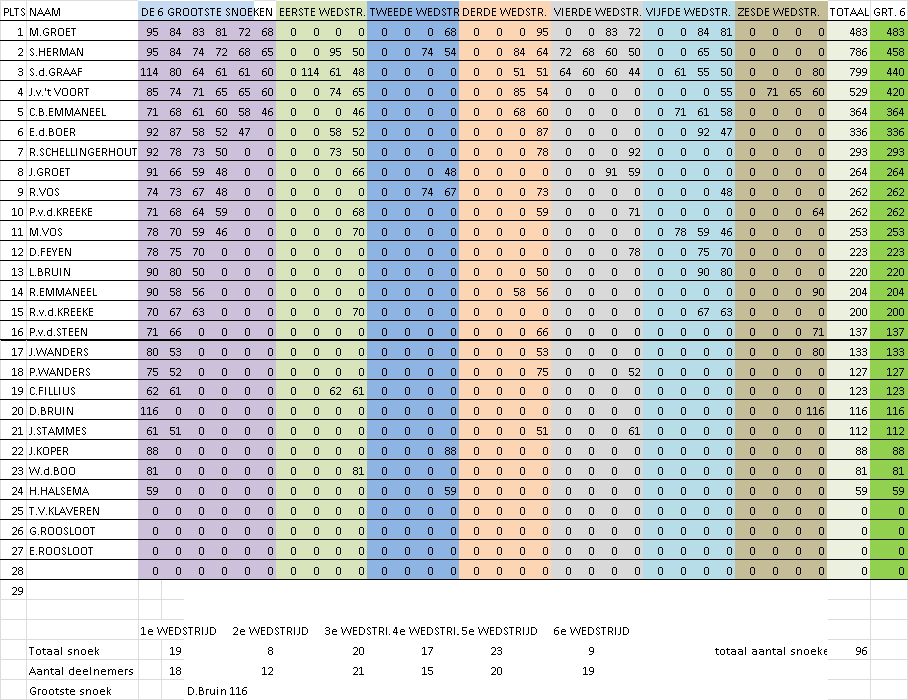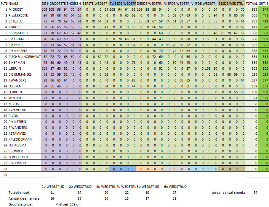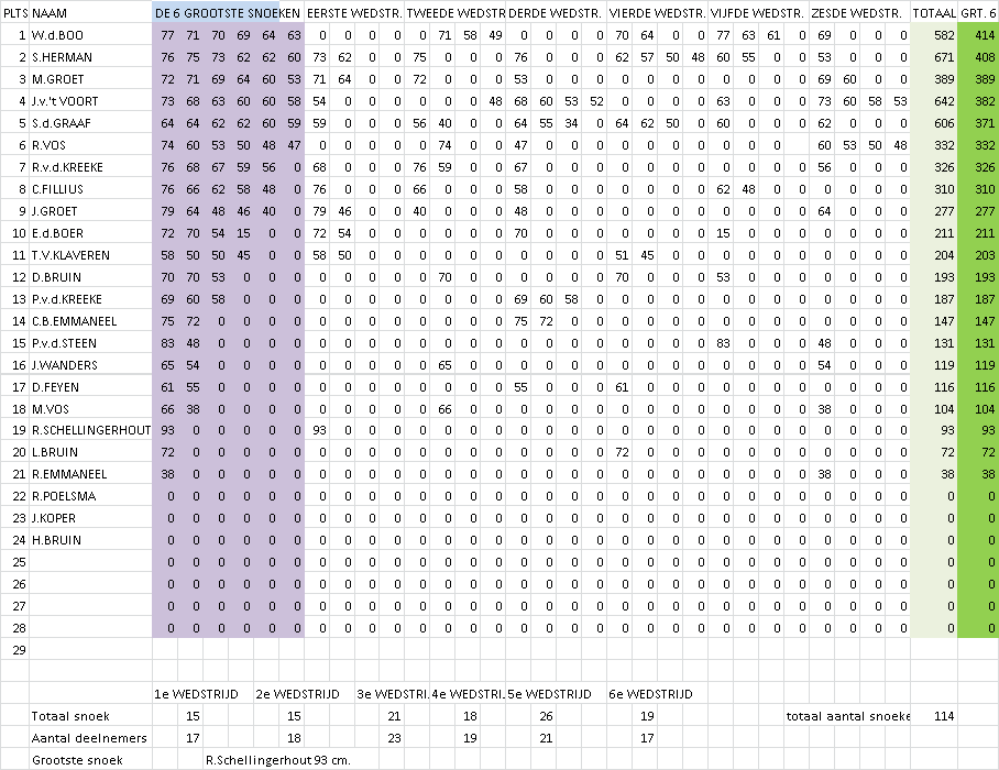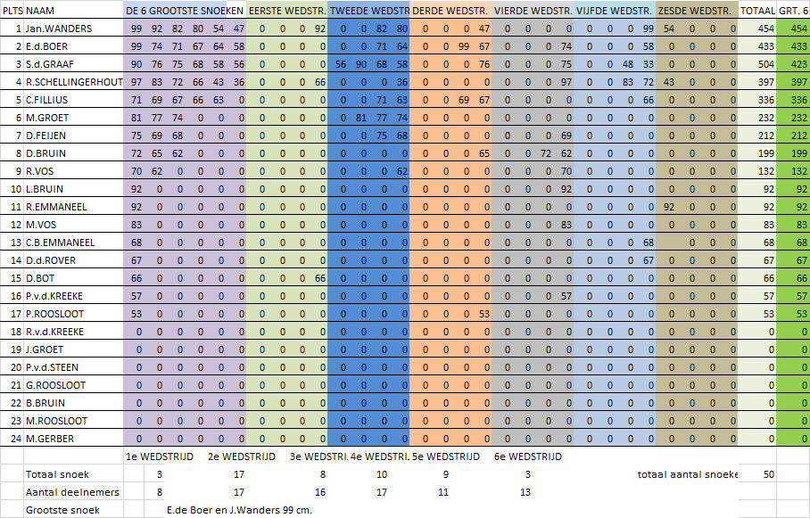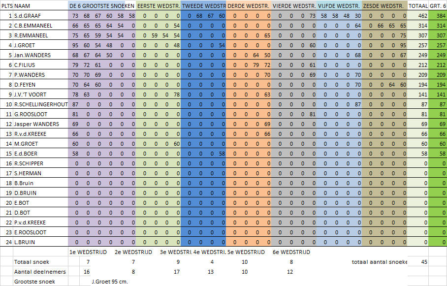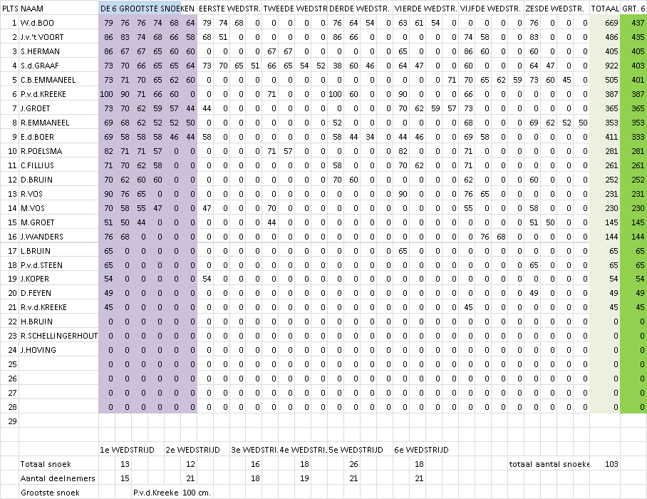 Voor de einduitslag zijn maximaal zes (de grootste) snoeken die de deelnemer gedurende de competitie heeft gevangen bepalend. De winnaar van de competitie is derhalve degene die met zijn/haar maximaal zes grootste snoeken de meeste centimeters heeft gevangen. Tweede wordt degene die hierna met zijn/haar grootste zes snoeken de meeste centimeters heeft gevangen etc. Er waren deze competitie overigens slechts 2 vissers die een rijtje van 6 snoeken wisten vol te vissen. De vangst was deze competitie weer niet al te geweldig. In totaal werden er over 6 wedstrijden slechts 37 snoeken gevangen. De uitslag van de snoekcompetitie is: